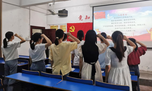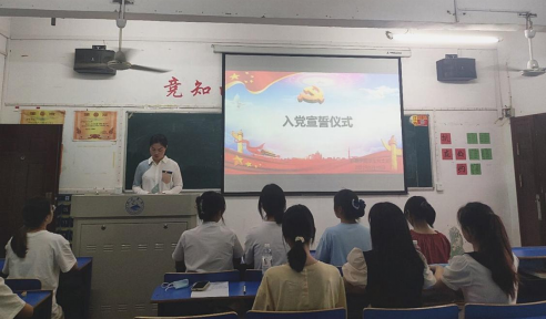 宣誓仪式在庄严雄伟的《国际歌》中拉开帷幕。入党宣誓,是党员政治生命开始的象征。党旗代表了党,誓词概括了党对党员的要求,也概括了党员对党组织和党的事业应承担的政治责任。在徐海燕同志宣读参加入党宣誓的预备党员的名单后,在谢舒婷同志的带领下,新党员面向党旗,目光坚毅,誓言铿锵,表达了自己为共产主义奋斗终生的坚定决心。