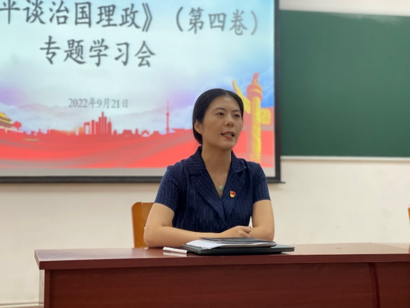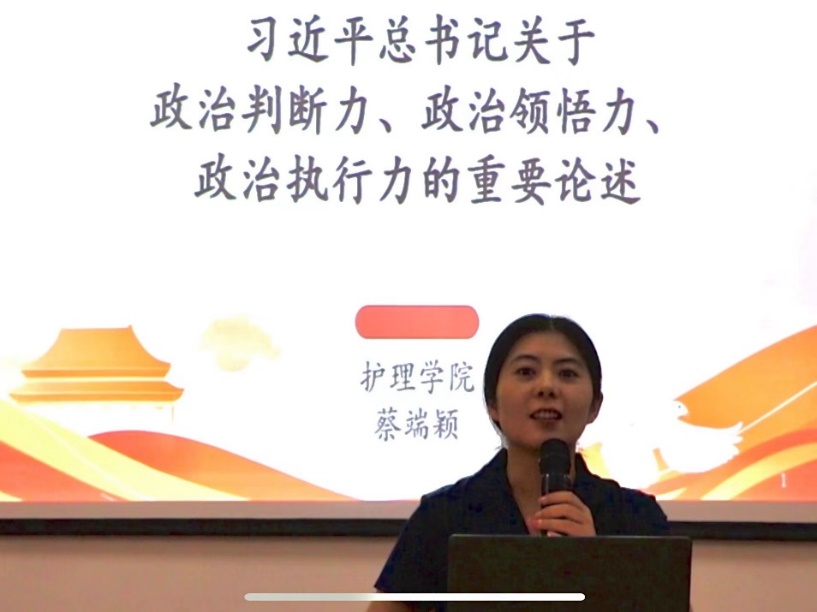 蔡端颖以《习近平谈治国理政》第四卷为切入点,围绕“提高政治判断力、政治领悟力、政治执行力”,分享了在理论学习中的感悟和体会,给全院教职工们作出指引和要求:必须增强政治意识,善于从政治上看问题,善于把握政治大局,不断提高政治判断力、政治领悟力、政治执行力,并准确理解这三种政治能力,在工作中贯彻落实。政治判断力是政治实践的前提。以国家政治安全为大、以人民为重、以坚持和发展中国特色社会主义为本,构成了政治判断的根本标尺。把握提高政治领悟力,需要多管齐下:学深悟透、化理论为方法、对“国之大者”要心中有数。提高政治执行力,要着重关注以下三个方面:同党中央精神对表对标、有政治执行的工作能力、有政治执行的责任担当。