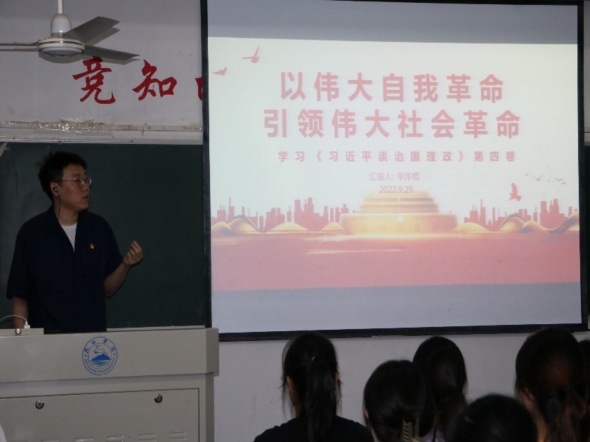9月29日,BB贝博艾弗森官方网站学生党支部于思贤楼205教室召开党员大会,由BB贝博艾弗森官方网站学生党支部书记李泽琨领学《习近平谈治国理政》第四卷部分内容,并开展了《以伟大自我革命 引领伟大社会革命》的专题党课。本次大会采取“线上+线下”双模式展开,学生党支部全体学生党员和入党积极分子参加学习。BB贝博艾弗森官方网站党委副书记龚英军出席。