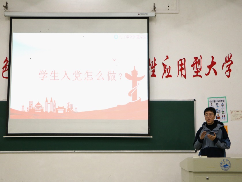 学生党支部书记李泽琨进行了“为什么要入党”、“学生入党怎么做”、“入党意味着什么”的专题解读,诙谐风趣的讲解深入浅出,既让新生们理解了学生党员的光荣和使命,更鼓舞了新生想要加入党组织的赤诚之心。