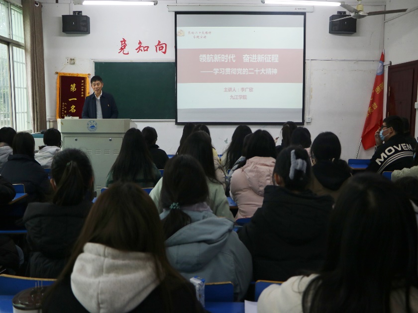 李广欣以党的二十大的大会主题作为引入,点明学习党的二十大精神要明确旗帜问题、道路问题、目标问题。从“新时代十年的伟大变革和历史性成就”、“开辟马克思主义中国化时代化新境界”、“时代新征程,中国共产党的使命任务”、“新时代新征程的重要部署和战略举措”、“立志做有理想,敢担当,能吃苦,肯奋斗的新时代好青年”五个方面做阐述, 并对所有同学提出三点希望:一是要心怀感恩,感恩父母,感恩老师,感恩国家,感恩新时代;二是要融入新时代,不做“观局之人”,跟上时代的节奏,与国家、与时代共同进步;三是要奉献新时代,珍惜时光,把握青春,为2050年全面建成富强民主文明和谐绿色的社会主义现代化国家做好铺垫。
