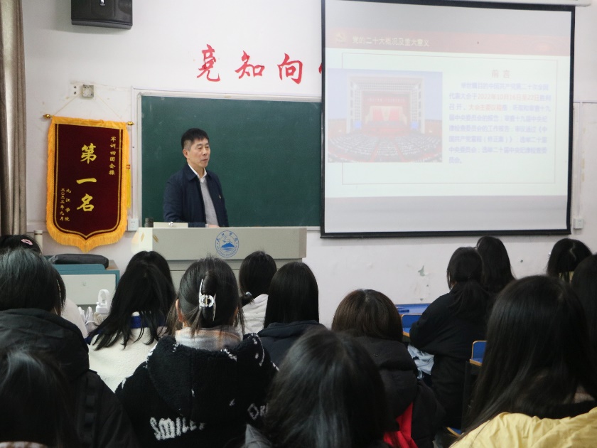 党的二十大的一系列新的思路、新的战略、新的举措绘就了新征程的宏伟蓝图,激荡人心、催人奋进。深入学习贯彻党的二十大精神,12月7日下午,校纪委书记李广欣来到BB贝博艾弗森官方网站,在思贤楼206教室为BB贝博艾弗森官方网站A2214班同学上了一堂主题为“领航新时代,奋进新征程——学习贯彻党的二十大精神”的专题党课。BB贝博艾弗森官方网站党委书记郭青主持,部分教师参加学习。