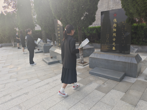 活动始伊,同学们走进烈士陵园,探访烈士墓区,领悟先烈的精神。大家肃立在先烈墓前默哀,向为国家和人民奉献出宝贵生命的先烈们献上鲜花,并致以最崇高的敬意。刘宥辰同学看着纪念碑上的英雄的名字,不禁感叹:“他们的名字承载着历史的进步,承载着那些艰苦岁月中不懈奋斗的精神,也承载着英雄人民的愿望!”