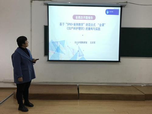 第一阶段省级教改课题负责人王庆军博士以《妇产科护理学》为例,论述了线上线下混合式课程教学改革在提高课程教学质量和促进学生全面发展方面所具有的重要意义及课程教改的具体实施方案。