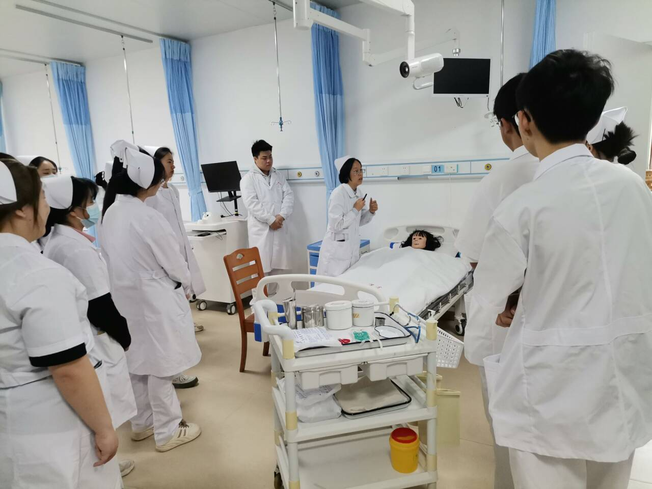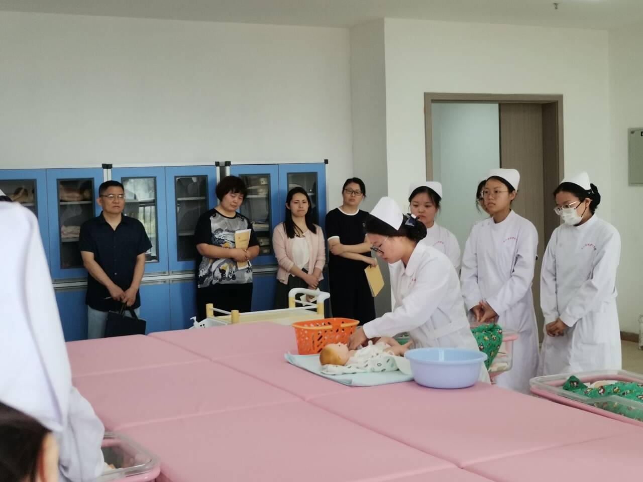 朱晓菊老师采用“理论讲解-示范操作-分组练习”的教学模式开展教学。在理论环节,朱老师系统讲解了实验目标、用物准备和操作要点,重点强调水温控制、皮肤保护和脐部护理等安全注意事项。在实践环节,朱老师进行标准化操作示范,完整展示婴儿沐浴的规范流程。学生分组观摩后,在教师指导下开展实操训练。这种循序渐进的教学设计,既保证了理论知识的系统传授,又强化了学生的实践操作能力,整堂课教学环节紧凑,示范操作规范,学生参与积极,有效提升了专业技能水平。