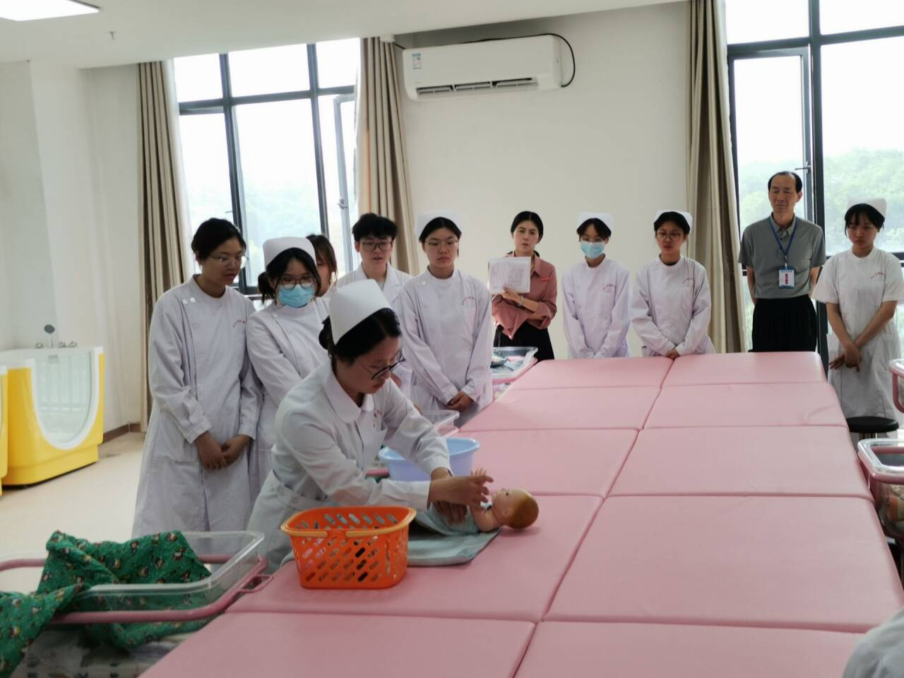 第三场示范公开课于2025年5月7日在护理实验楼507举行,由妇儿科护理学教研室朱晓菊老师主讲《儿科护理学》课程中的“婴儿沐浴法”。