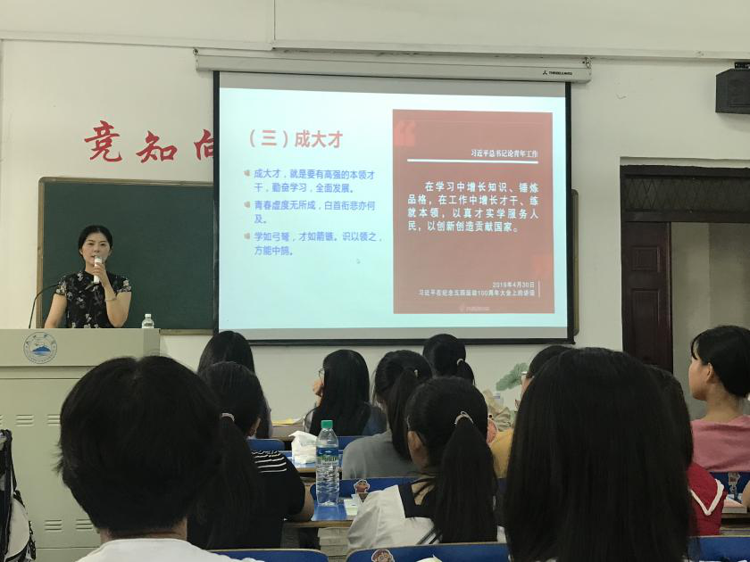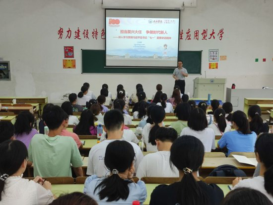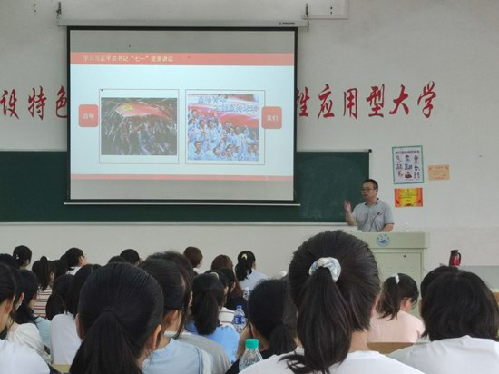 闫来英从河南洪灾、奥运赛场、神舟巡天中的青春身影入手,深入阐述了习近平总书记“七一”重要讲话精神的重大意义、主要内容和丰富内涵。教育引导学生把灾难当教材,与祖国共成长;把经历当财富,与时代同奋进;把梦想当动力,与奋斗常相随。号召青年大学生在新征程中担当复兴大任,争做时代新人,用实际行动践行“请党放心,强国有我”的青春誓言。