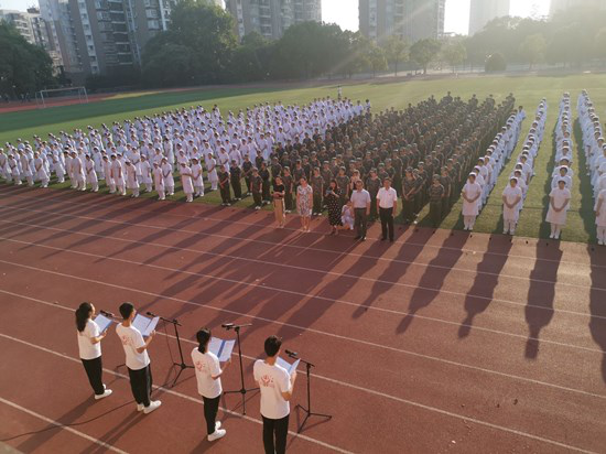 升旗仪式在全体师生《没有共产党就没有新中国》的合唱声中结束。