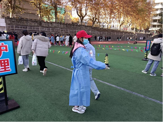 上午9点,志愿者们有条不紊地进行着准备工作。一部分在牵拉彩旗线布置场地,一部分在搬运核酸检测所需物品,还有一部分在张贴指示表……而充分的准备工作也使下午的核酸检测工作顺利进行。下午2点,志愿者们在负责人的指导下,分为三组。第一组负责在核酸检测进口检查同学们的健康码及是否正确佩戴好口罩,维持入场秩序,避免进口拥挤;第二组负责组织同学们有序排队进行核酸检测,协助医务工作人员搜集核酸检测所需条形码,按要求进入采样区采集咽拭子;第三组即为后勤组,负责在核酸检测活动结束后,整理工作场地以及打扫卫生。