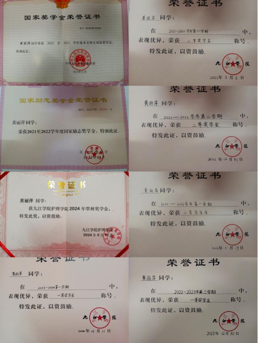 黄丽萍在日常学习生活中秉持“竞知向学,厚德笃行”的坚定态度,磨炼顽强意志,淬炼品格,争当实干的排头兵,奋勇争先,获评“勤奋学习标兵”“三好学生”等优秀称号。她始终以严谨的态度对待专业课程,翻动的书页恰似她前进的脚步,坚持与毅力让她在这四年中不断突破自我,成为同学们学习的榜样。除专业课程外,她还注重自身文化内涵的培养,阅读了大量课外书籍,《简・爱》《霍乱时期的爱情》《围城》等书籍深受她喜爱。每当陷入精神内耗,她都能从学习、阅读的过程中获得极大的满足感,这激励着她珍惜大好学习时光,不断成长。