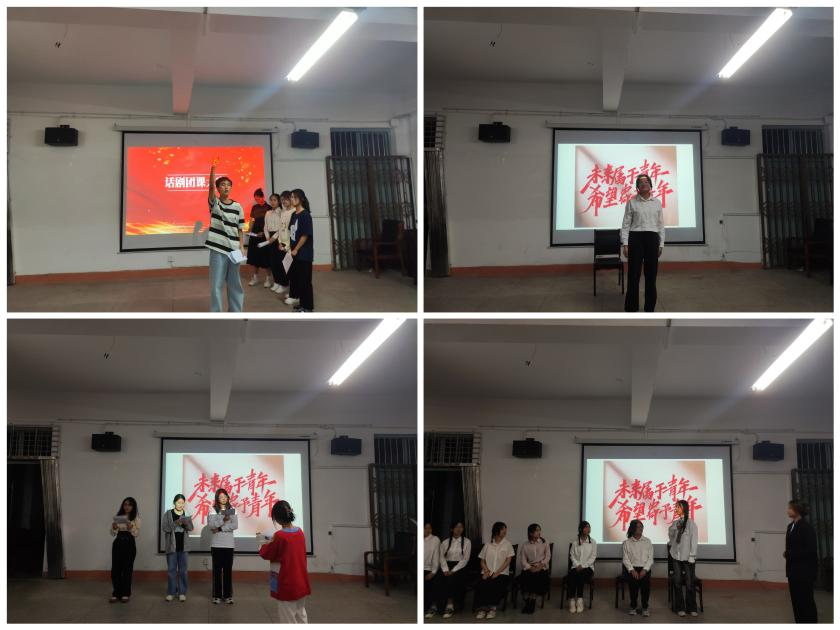 “话剧团课”比赛中,第一组同学学习五四爱国精神,生动再现了爱国青年游行的历史画面,带给观众满满感动与力量。第二组的同学演绎李大钊、陈独秀两位先烈在五四运动中爱国救民的经典桥段,深情朗诵了《欢迎独秀出狱》。第三组同学们则以五四运动为背景,展现当时革命爱国青年不畏北洋政府的镇压,积极投入抗争洪流中···参赛同学带来一场场民族危难之际青年知识分子积极参加反帝反封建爱国运动的视觉盛宴,用饱满的精神、昂扬的斗志告诉在场人员青年强,则国家强。