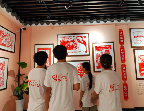 “红细胞”们展现出良好的精神面貌,带着满满的求知欲和探索欲到达瑞昌剪纸博物馆,映入眼帘的是经典的徽派建筑——白墙黛瓦马头墙,成员们兴趣高涨,心情激动,踏入非遗文化的圣地。讲解员从“精工溯源”“以梦荟艺”“文脉传承”“致敬瑞昌手艺人”“又见绝艺”“剪纸殿堂”这六个文化主题展现瑞昌的剪纸历史足迹和发展传承情况。“红细胞”细细观摩欣赏剪纸作品,了解到剪纸有去线留面的阴刻、去面留线的阳刻,与雕刻技艺存在异曲同工之妙。“撕、剪、刻、灼”是剪纸的四种方式,讲解老师提及无论哪种方式都需要师傅用巧劲才能把作品完美的展现。