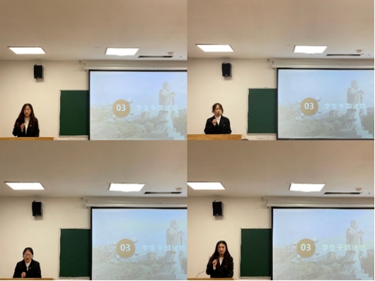 会议伊始,全体参会人员齐唱《光荣啊,中国共青团》,同学们洪亮而饱含激情的声音拉开了大会庄重而热烈的帷幕。学生会轮值主席曾思意首先就学生会的整体工作与未来规划进行汇报,承诺将继续保持认真工作的态度,为全体学生创造优良的学习环境。紧接着,各部门部长依次上台述职汇报,纷纷做出将加强合作,取长补短,共同建设美好未来的决心。