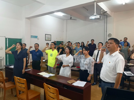 在副院长蔡端颖的带领下,新入职的三名教师面向国旗郑重宣誓,全体教师一起重温人民教师誓词。