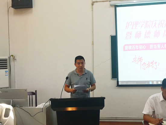 在庄严的国歌声中,大会拉开序幕。易本谊宣读了学院获得学校师德师风标兵、课程思政优秀教师的表彰文件及优秀教师、优秀教育工作者、先进集体及优秀班主任、辅导员名单,