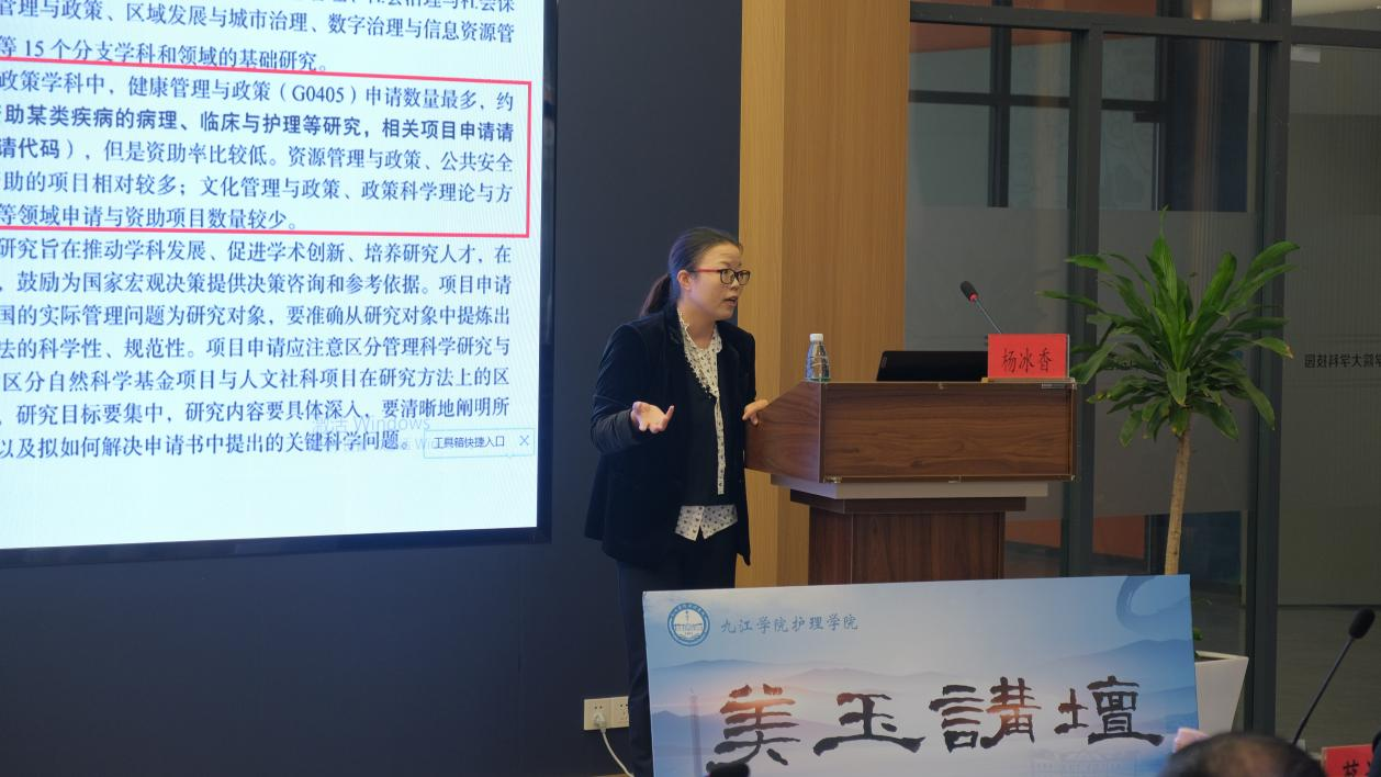 聘任仪式结束后,杨冰香主讲了题为《国家自然科学基金申报趋势分析及申报书撰写要点》的学术讲座,结合她自身成功中标国家自然基金青年项目、面上项目的经验和准备,以及成功培育团队其他成员获得国家自然基金项目立项的经验,详细与会人员分享了申报的准备过程、科研的初心和坚持、基金申报渠道和途径分析、基金申报趋势发展以及标书撰写的要点。整场讲座持续近2小时,与会人员均表示受益匪浅。